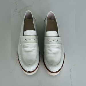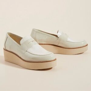 Elegant cream/white/blue color patent leather loafers with a stylish platform. Perfect blend of comfort and fashion.