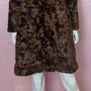 Express longline jacket coat with a soft, brown faux fur exterior, with convenient pockets.