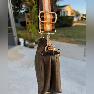 Black with a striped, multi-color (black, white, gold-tone) strap removable and adjustable and gold-tone hardware