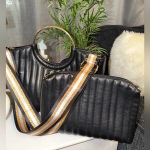 Pre-Loved Condition Like New! Chic black quilted design. Gold ring handles. Stylish striped strap. Perfect for versatile use. Aldo