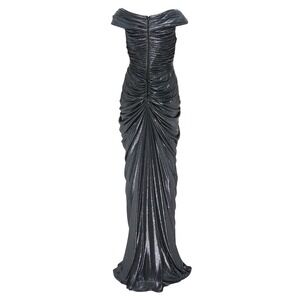 Capture the spotlight in this breathtaking Tadashi Shoji gown, designed to make you feel like a goddess. The off-the-shoulder neckline elegantly frames your décolletage, while intricate ruching sculpts your silhouette, creating a mesmerizing draped effect that flows down to a dramatic high slit. Its shimmering metallic finish catches the light with every movement, ensuring all eyes are on you. Perfect for galas, black-tie events, or an unforgettable evening of glamour.