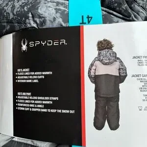 Stylish Spyder snowsuit with jacket and bib pant. Features black and gray design. Perfect for winter adventures.