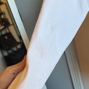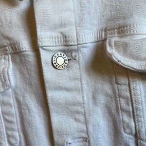 Elevate your style with the White Denim Jacket. Perfect for any occasion, this jacket offers a classic look with a modern twist. Light stain on right sleeve as pictured, can be easily removed.