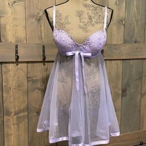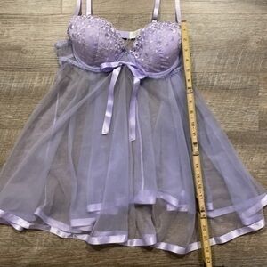 Lavender sheer lace babydoll slip nighty/teddy.Eyelet lace and bra. Adjustable straps. Satin trim. Underwire.