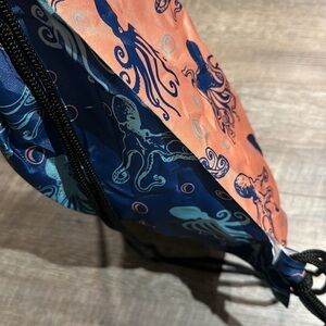 Karma 12x16” blue/peach nylon drawstring, cinch sack octopus backpack . Double sided graphic print with octopus and bubbles. Peach/pink and navy blue. Black nylon drawstring cord. Lightweight. New without tags.