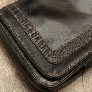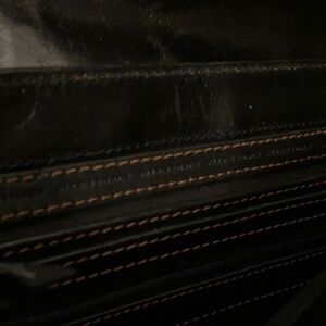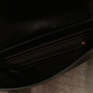 Ellen Tracy black leather shoulder bag. Contrasting orange stitching. Interior zippered pocket. Flap with magnetic closure. Excellent pre-loved condition.