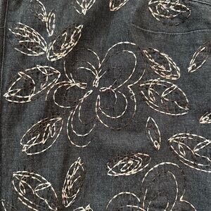 The key detail is the all-over, light-colored embroidered pattern of stylized flowers and leaves, giving it an artisanal, customized look. It includes two patch pockets at the waist.