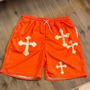Vibrant orange shorts featuring a bold cross design. Perfect for casual wear.