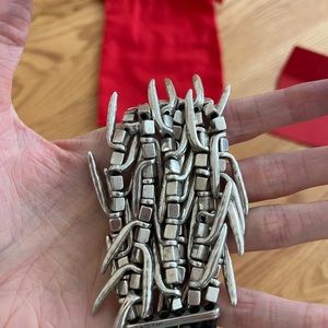 Intricately designed with a variety of both black and silver beading, and featuring silver spikes as its main attraction, this classy meets edgy piece of wearable art is sure to draw attention and make for great conversation. Six beaded/spiked rows and secured with toggle closure = only one of fifty made