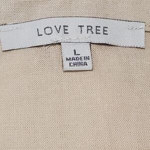 Shott sleeve blouse is beige, has a collar, and has a V-neck with three buttons and two pockets on the front. The sleeves each have a button. There are no discolorations, snags, or rips. Fabric is 55% linen and 45% viscose.