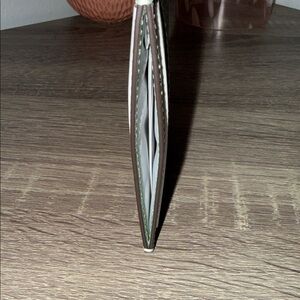 4 exterior credit card slots. Open middle compartment. Small logo plate.
