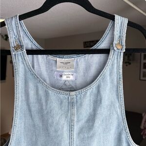 Light blue denim overall dress featuring cute animal designs on the pockets.