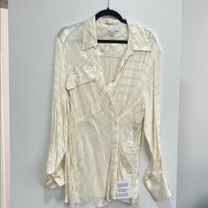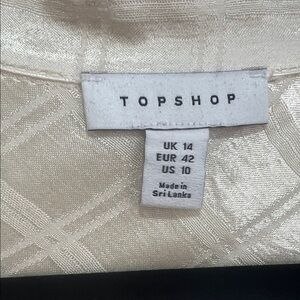 Satin cream button-down by Topshop. Has subtle plaid design and asymmetrical style. Never worn, return tag is still attached!