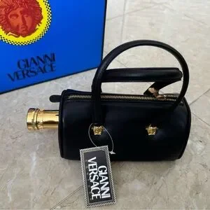 This Versace Purse features a sleek black textured leather exterior with luxurious gold-toned hardware. Its structured cylindrical shape and short rounded handles make it a stylish accessory for any occasion.