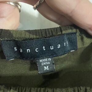 Chic blouse with a green camouflage design. Features stylish ruffle sleeves. Ideal for casual wear.