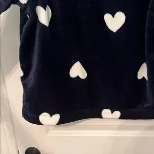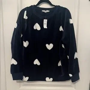 Cozy navy sweatshirt with white heart pattern. Soft and stylish. Perfect for casual wear.