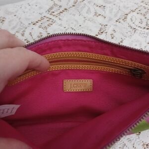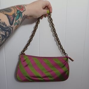 Vintage J.Crew silk mini baguette shoulder bag. Pink and green stripe design. Metal strap/handle. Hot pink interior.