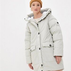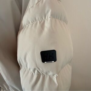 Helly Hansen Arya Cream Hooded Puffer Jacket. Chic and cozy. Ideal for cold weather. Super warm. Color is a light beige cream color. Size XS but fits oversized. Measures 24” pit to pit on the outside (I would subtract a couple inches because of how puffy the outside is) and 32” in length. Overall good condition. No major flaws. Only worn once. Ask any questions!