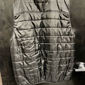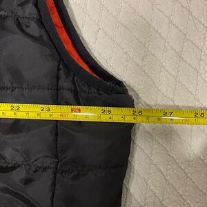 Sleek black vest with vibrant orange lining. Ideal for layering. Features a quilted design and zip closure.