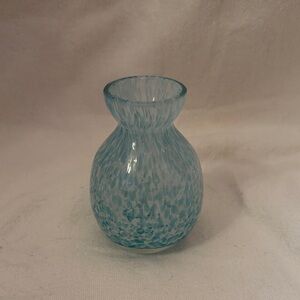 This is a hand-blown art glass bud vase with a blue and white speckled or spotted pattern. It is also known as a Ruffled Edge Spotted Vase.