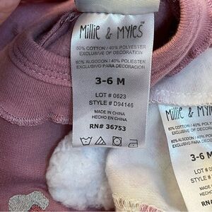 Sweet Millie & Myles two-piece baby outfit (size 3–6 months) featuring a dusty rose ruffle-sleeve top with fluffy animal ears and face embroidery, matched with soft leopard-print joggers. Preowned, excellent condition, no flaws.