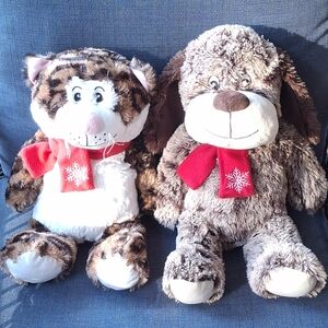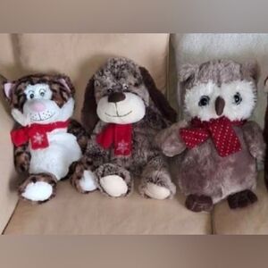 3 winter stuffed animals plushes with snowflake scarves. Tiger cat, puppy dog, owl. Range from about 16" to 12" high and 9" to 12" wide. Owl is by Dan Dee, and the dog and cat are Macy's New Year's animals. Smoke and pet-free home.
