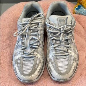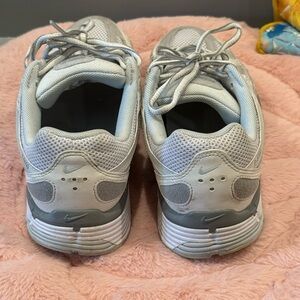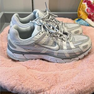 Nike Women’s P-6000 Sneakers. Pre-used and in good condition. Minimal wear in interior and tread. Color is white and platinum. Size 7.5. Foam cushioning, breathable comfort, lace up, rubber outsole.