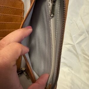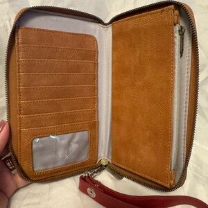 Elegant zip-around wallet showcasing a charming orange floral print against a rich burgundy background. Features a convenient red wristlet strap and silver-tone hardware for easy carrying. The spacious design offers essential organization for your daily essentials. Smoke free. Offers welcome.