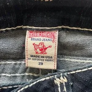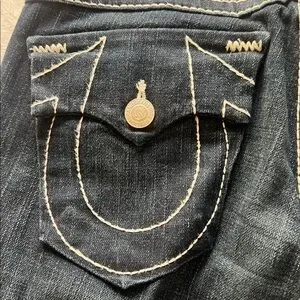 Chic True Religion indigo low rise flare jeans with contrast stitching. Perfect for a trendy look. Women’s 29.