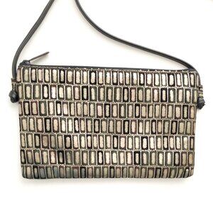 Genuine leather shoulder bag from Bags by Pinky, made in the USA, has a top zip opening, an outside zip compartment, and an inside zip pocket. Black with gold metallic geometric designs, plain black fabric interior. Thin black leather strap with knot detail where strap attaches.