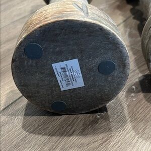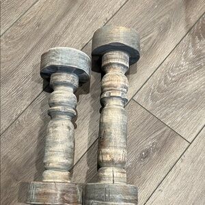 Enhance your home decor with these rustic wooden candle holders. Their natural brown finish adds a warm, earthy touch to any room. Measures 13” and 15” tall. Great condition.