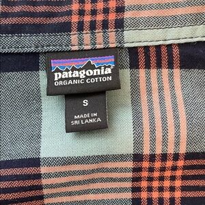 Classic Patagonia button-down with green and orange plaid. Perfect for casual wear.