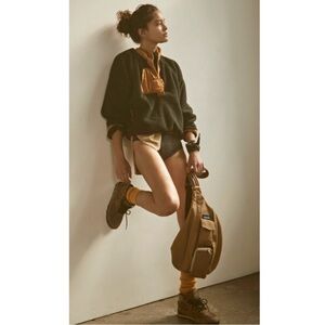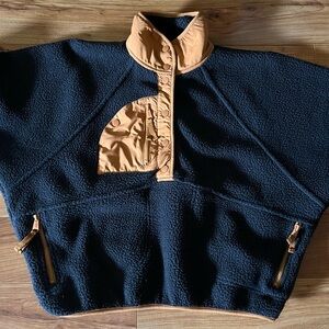 100% poly, cozy fleece material, oversized slouchy fit, quarter snap button closure, color block detail, pullover style, approx measurements shown, contrast nylon pocket, zippered side pockets, elastic cuffs, black and orange colorway, great for layering, post gym, workout, activewear, loungewear, outdoor, athleisure, streetwear, gorpcore, hiking, athletic