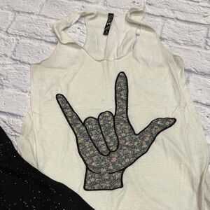 Set of two tank tops featuring unique graphic designs. One black with an owl print, and one white with a hand “I love you” sign graphic.
