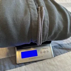 Hoodie has obvious signs of wear, logo cracking, holes and stains as shown
