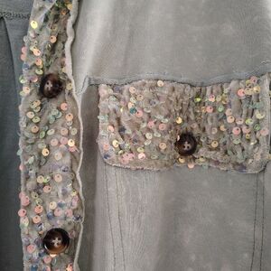 Stylish jacket with sequin trim. Features buttoned pockets and a relaxed fit. Perfect for adding sparkle to any outfit.