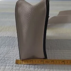 Chic light beige crossbody bag with a modern look. Features a buttoned flap and adjustable and changeable strap. 7 inches long, 6 inches wide. Ideal for daily use.