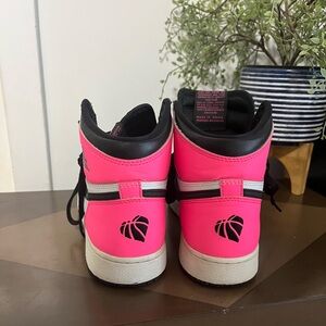 Authentic Nike Air Jordan 1 Mid sneakers in a bold pink, black, and white colorway.