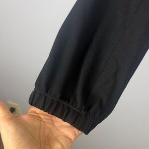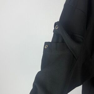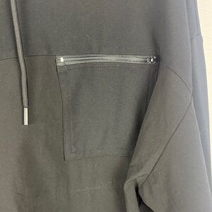 Sleek black hooded sweatshirt by CAbi, has a pocket on one of the sleeve, a zipper pocket at the left chest. Comfortable and versatile design.