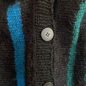 Oversized, hand knit, Dolman sleeved cardigan is black with turquoise, teal, and blue vertical striped design. It has pockets and buttons down the front.