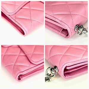 Crafted in quilted pink leather with silver-tone hardware, this versatile piece offers multiple styling options. Wear it crossbody or on the shoulder using the non-branded chain, drape the pearl accent across the front for an elevated look, or remove the chain entirely and carry as a chic petite clutch.