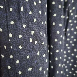 Worn lightly, great condition. Navy/white with speckled dots and floral background