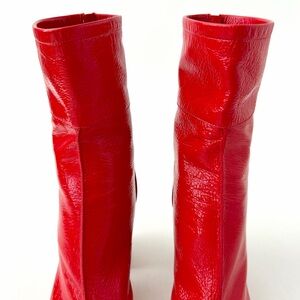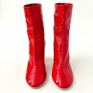 tags: chanel, cc logo, red boots, block heel boots, ankle boots, patent leather, designer shoes, luxury footwear