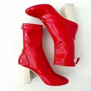 CHANEL | Red Patent Leather CC Logo Block Heel Ankle Boots EU 37.5
