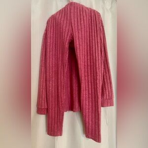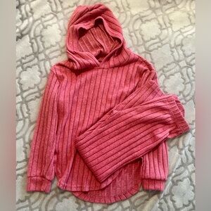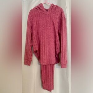 Super soft ribbed knit two-piece lounge set in a pretty rose pink shade from SHEIN. Includes a long-sleeve hooded pullover top and matching ribbed pants. Stretchy, cozy, and lightweight — perfect for lounging, sleepwear, or comfy everyday wear.