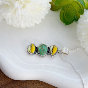 Honey Dahlia Turquoise and Green Copper Turquoise Pendant Jewelry Set Lot Boho Southwest Style Sterling Silver 925 Oval and Pear Shapes Handmade New without tags. Includes packaging. Also, includes 20” 1mm chain, white agate, yellow jade, & prehnite and wood jasper stretchy 7” or so bracelets. Marked 925. Genuine gemstone jewelry made well to last.