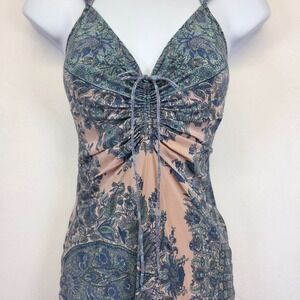 This Plenty by Tracy Reese women's silk dress is crafted in 100% silk with a blush base and intricate blue floral paisley print. Designed with a V neckline, ruched bust with adjustable drawstring tie, and a gently flared hemline that moves beautifully. This piece offers a lightweight, breathable luxury feel perfect for spring and summer wear.