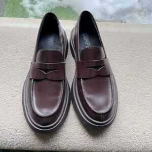 Stylish brown leather loafers from Camper Shoes. Perfect for any occasion. Comfortable and versatile, these shoes are a must-have for your wardrobe. Worn twice, they look and feel brand new.