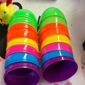 Set of vibrant plastic Easter eggs. Includes green, orange, yellow, pink, and purple colors. Perfect for Easter celebrations.
