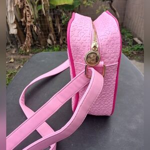 Stylish pink crossbody bag perfect for everyday use. Features a sleek design with a clear front pocket. Ideal for adding a pop of color to any outfit. The bag is missing the barbie pins in front